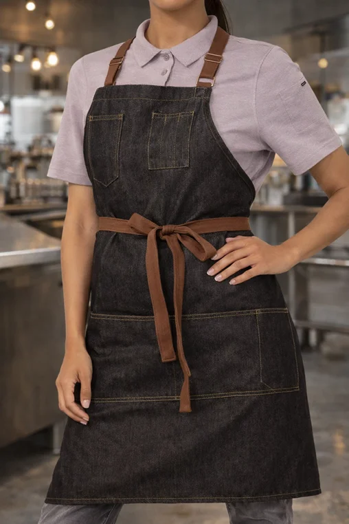 Un delantal de mezclilla protege la ropa durante el trabajo en restaurantes, cafeterías o espacios gastronómicos.